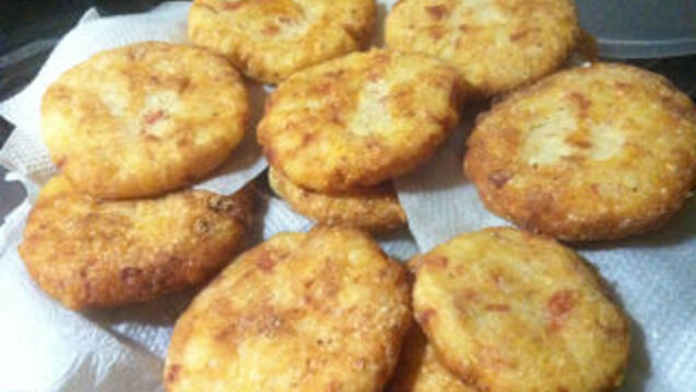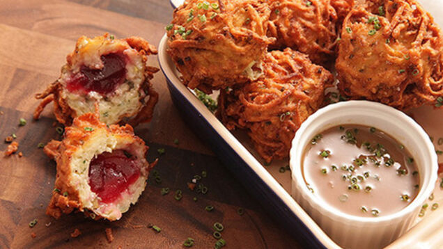 Crisp latke-style potato and onion batter crusted ball encased in turkey and sage sausage stuffing shell with a liquid cranberry sauce center.»11/10/13 11:31am11/10/13 11:31am