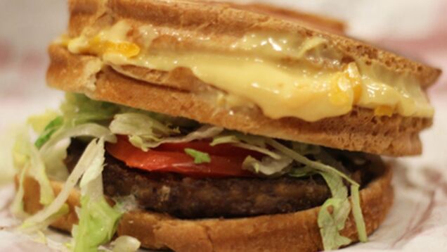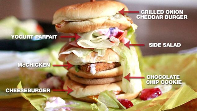 A single sandwich made of all the McDonald’s Dollar menu items including a McChicken sandwich, chocolate chip cookie, grilled onion cheddar burger, side salad, cheeseburger, and a yogurt parfait. »10/28/13 3:32pm10/28/13 3:32pm